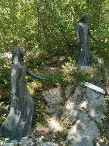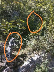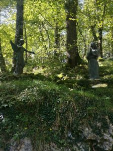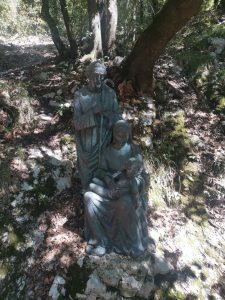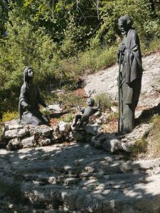Oggi il luogo conserva un profumo di spiritualità, per il silenzio che accompagna discesa e risalita dalla provinciale al cancello del Santuario, e soprattutto per le grandi statue in bronzo – come in un Sacro Monte – collocate nella seconda metà dell’Ottocento, che rappresentano i cinque misteri gaudiosi del Rosario: l’Annunciazione, la visita di Maria a Elisabetta, la Nascita di Gesù, la Presentazione al Tempio (questo “quadro” mi ha dato più di una suggestione: la presentazione è quasi un’offerta, sullo sfondo campeggia la croce, si veda la foto), il ritrovamento di Gesù nel Tempio.