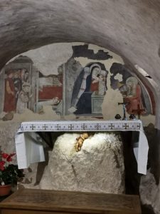Dove venne allestito il primo presepe vivente sorse la chiesa (già nel 1228, anno della canonizzazione del Serafico) e l’annesso convento. La grotta di allora fu affrescata (scuola giottesca del XIV secolo) con un dipinto che rievoca il Natale di Betlemme e a sinistra quello di Greccio.