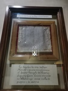 Nella memoria della povertà del Bambino di Betlemme – come lo chiamava – e nella letizia giocosa della rappresentazione dell’Evento, Francesco concludeva un anno difficile: aveva appena definito, con fatica, il testo della Regola (foto) dettato dal Cristo stesso a Fonte Colombo.