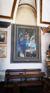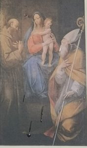 L’immagine, con riflesso indecente e poi riproposta con sgranatura fastidiosa, è dell’opera più insigne conservata nella chiesa di San Biagio a Fiuggi: è un’opera del maestro del Caravaggio, il Cavalieri d’Arpino, che ritrae la Vergine tra san Francesco e sant’Agostino.