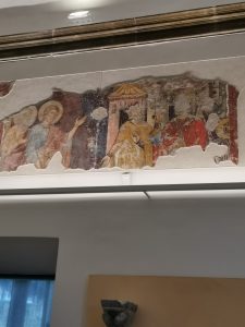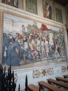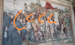 Da sinistra a destra l’abate Boccarini nei panni di San Nilo, il cardinal Farnese nei panni dell’imperatore Ottone III, il Guercino con la lancia, Domenichino palafreniere, Guido Reni appoggiato al cavallo e la bella di Frascati (Marietta?) di cui Domenichino si era invaghito.