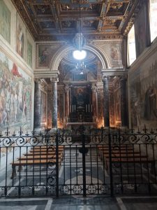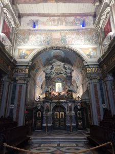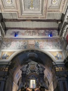 L’interno, ricco di icone splendenti, è decorato secondo un gusto barocco, ma essenziale, con tracce di affreschi del XIII secolo sopra l’iconostasi. Irrinunciabile la visita alla “crypta ferrata” (luogo della visione mariana di san Nilo, inglobata nella chiesa, a costo di correggere il tradizionale orientamento a Levante dell’altare) e alla cappella Farnese, interamente affrescata dal Domenichino (1581-1641), dedicata ai due fondatori, Nilo e Bartolomeo.