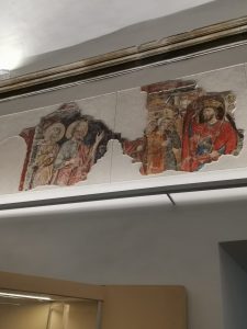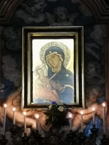 Al di sopra dell’iconostasi – il frammezzo che nel rito greco-bizantino separa il presbiterio dall’assemblea dei fedeli – nella chiesa abbaziale trionfa l’icona della “Theotokos” (la Madre di Dio), dipinta su tavola dorata, secondo il tipo iconografico detto Odigitria (Colei che indica la Via). E’ l’immagine che veneravano già san Nilo e san Bartolomeo. Probabilmente è una delle tante icone che i monaci greci dell’Italia meridionale riprodussero, imitando quelle che in oriente la furia degli iconoclasti (VIII – IX sec.) aveva distrutto. Nel 1140 Tolomeo II, conte di Tuscolo, depredò la Chiesa di preziosi oggetti e fra questi forse ci fu l’icona della Vergine. Fatto è che una tradizione ben fondata dice che questa icona fu venerata per molti anni in una chiesa di Tuscolo. Nel 1191 Tuscolo fu distrutta dai Romani e l’icona fu portata a Roma. Nel 1230 veniva riconsegnata da papa Gregorio IX ai monaci dell’Abbazia e solennemente intronizzata.